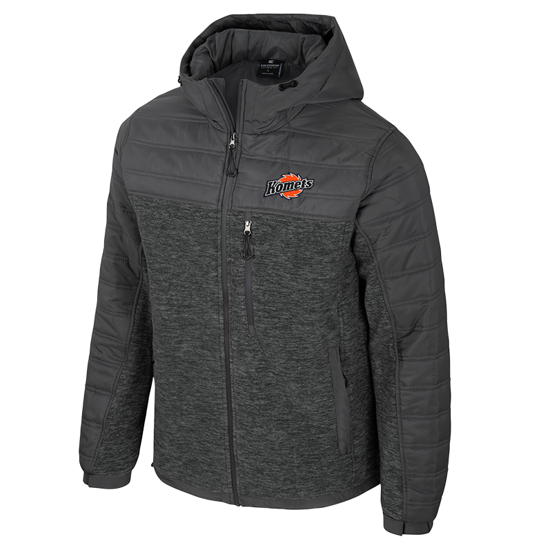 Poly slub Fleece Puffer Jacket. Embroidered logo on front and back. 3 panel sleeve, Side zipper pockets with string puller. 3 panel hood with hood toggles. Adjustable elastic cuffs.