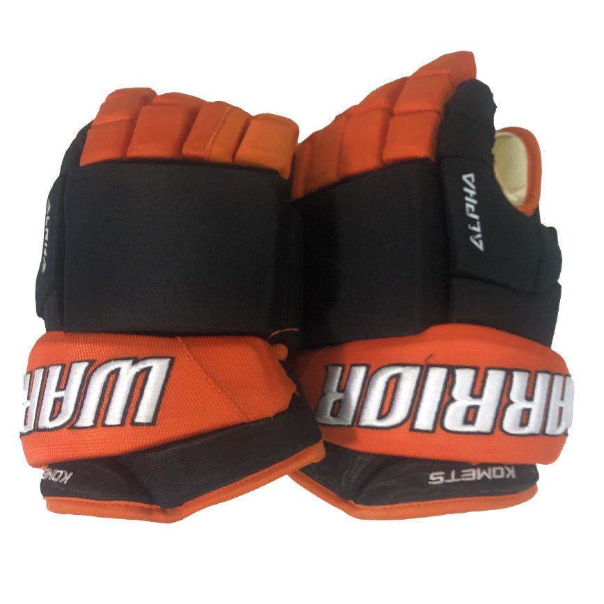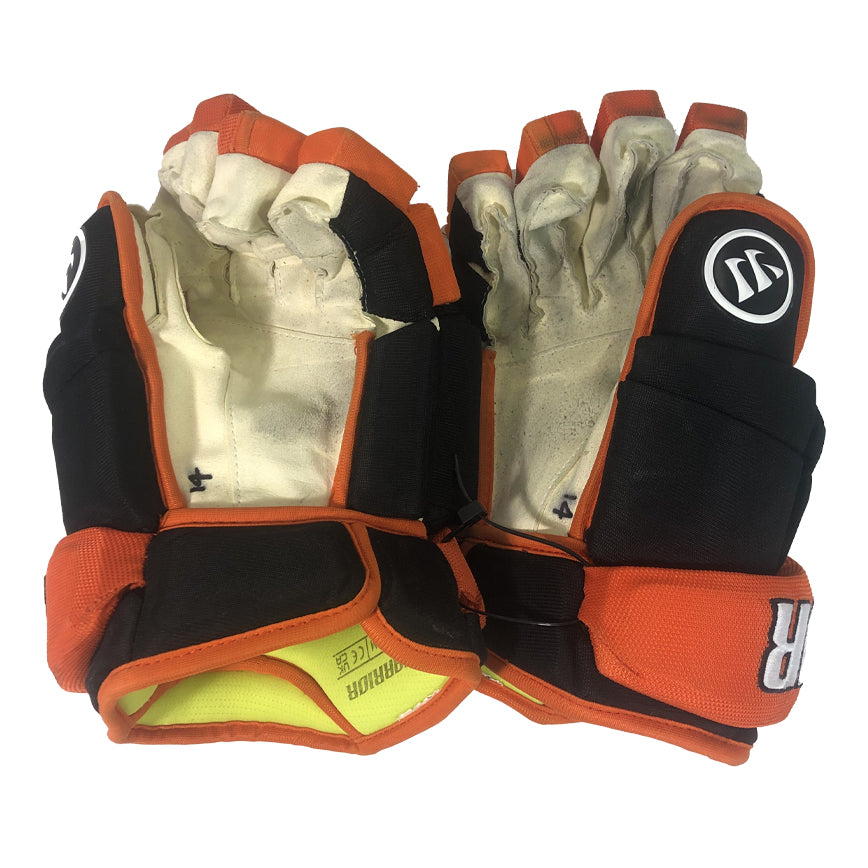 Game-Used 2024-25 Cullen Ferguson Black/Orange Warrior Hockey Gloves