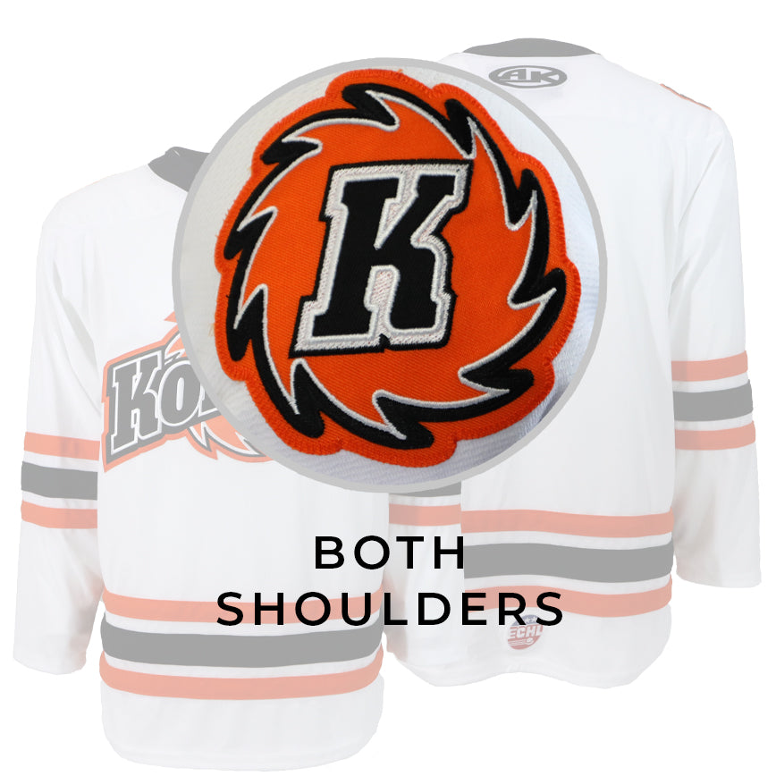 The 2025-26 White replica jersey features a fully embroidered logo crest. Embroidered and sewn on Fireball K patches on the shoulder. The striping has been updated on this year's version.